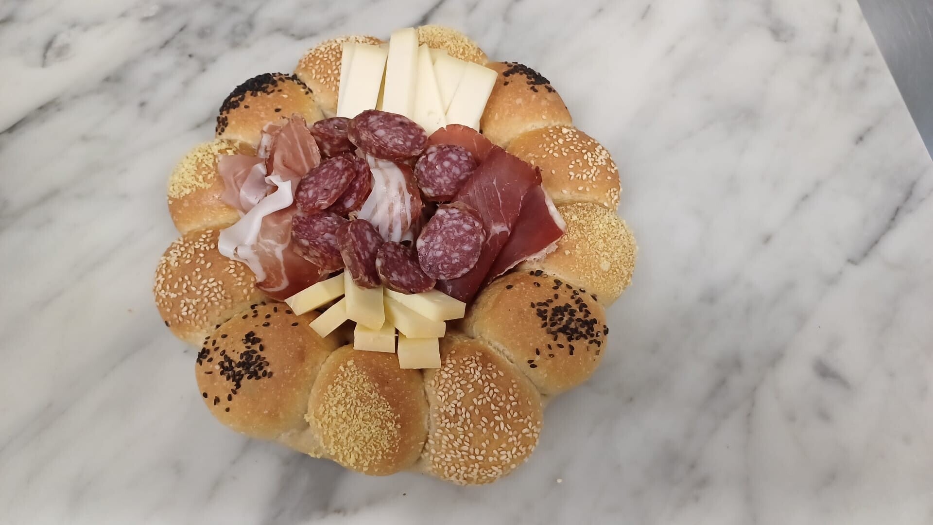 Pain assorti de 12 mini ballons avec assortiment de saucisse sèche, lard sec, viande séchée et jambon cru ainsi que de fromage à raclette et tomme d'Ayent